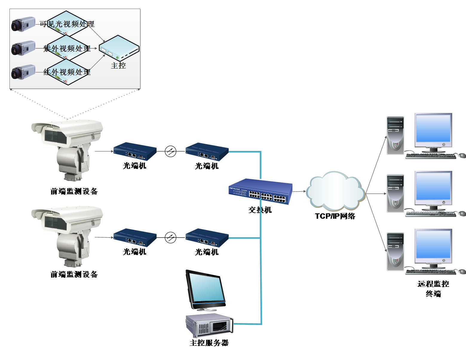 可见光视频单元、紫外视频单元、红外视频单元将三路视频实时输出到后端对应的视频处理及传输单元;后台主控服务器接收三路视频,计算设备温度与紫外光子数据,并调用视频处理模块,将多路视频叠加,便于定位分析。同时主控服务器对所有视频进行存储,并提供流媒体服务。主控服务器根据操作员的指令或预存的巡航指令,通过网络发送控制命令至前端监测设备,控制云台与镜头电机。远程监控终端可登陆主控服务器实时监测前端上传的视频,查看主控服务器上传的监测数据。